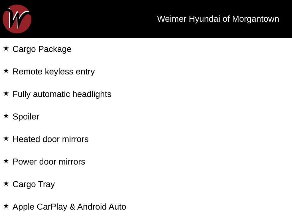 **Weimer Hyundai of Morgantown is your premier destination for both new and Used vehicle's and is proud to be the only non-commission-based dealership in the area. At Weimer Hyundai, we are eager to buy your trade-in! Before you consider selling your vehicle to www.carmax.com or listing it on www.autotrader.com, Cars.com, or www.ebay.com, reach out to our Inventory Manager at (304.658.7800) for a fantastic offer. WE PROMISE TO GIVE YOU $500 MORE THAN ANY Kelly Blue Book Instant Cash OFFER!**