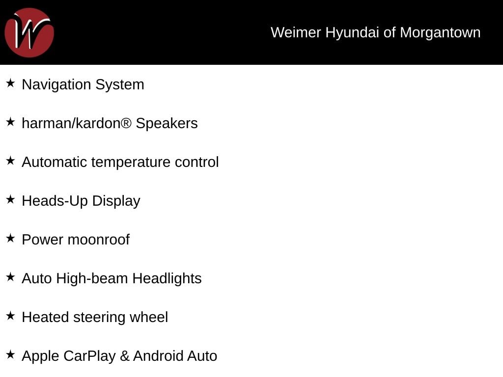 **Weimer Hyundai of Morgantown is your premier destination for both new and Used vehicle's and is proud to be the only non-commission-based dealership in the area. At Weimer Hyundai, we are eager to buy your trade-in! Before you consider selling your vehicle to www.carmax.com or listing it on www.autotrader.com, Cars.com, or www.ebay.com, reach out to our Inventory Manager at (304.658.7800) for a fantastic offer. WE PROMISE TO GIVE YOU $500 MORE THAN ANY Kelly Blue Book Instant Cash OFFER!**