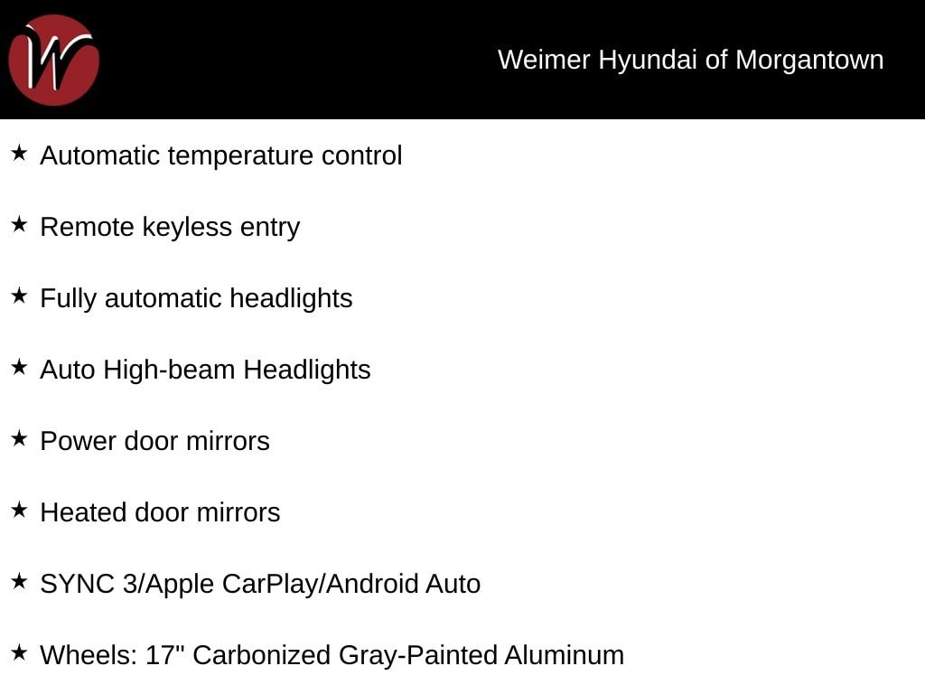 **Weimer Hyundai of Morgantown is your premier destination for both new and Used vehicle's and is proud to be the only non-commission-based dealership in the area. At Weimer Hyundai, we are eager to buy your trade-in! Before you consider selling your vehicle to www.carmax.com or listing it on www.autotrader.com, Cars.com, or www.ebay.com, reach out to our Inventory Manager at (304.658.7800) for a fantastic offer. WE PROMISE TO GIVE YOU $500 MORE THAN ANY Kelly Blue Book Instant Cash OFFER!**